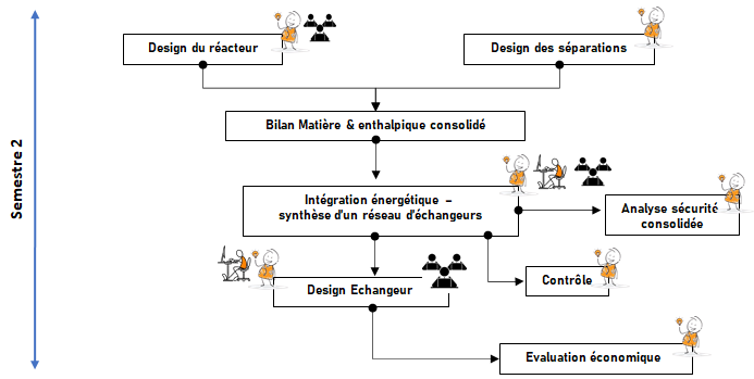 Au cours de ce semestre, les étudiants abordent la deuxième partie de l'ASM : conception des opérations unitaires fondamentales (réacteur catalytique, distillation, cristallisation, échangeurs thermiques...), consolidation des bilans matière et des bilans thermiques, étude intégration énergétique pour la synthèse d'un réseau d'échangeurs de chaleur, évaluation économique, étude de sécurité, contrôle et régulation
